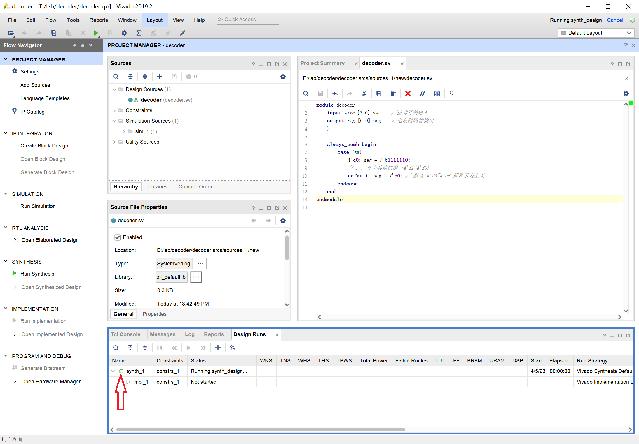 注意:这里创建项目的流程是给同学们演示一个 Vivado 项目的各个环节,以实验4的项目为例,包括创建项目,编写代码,综合,实现等的过程,理解整个流程可以帮助理解硬件设计的过程。
