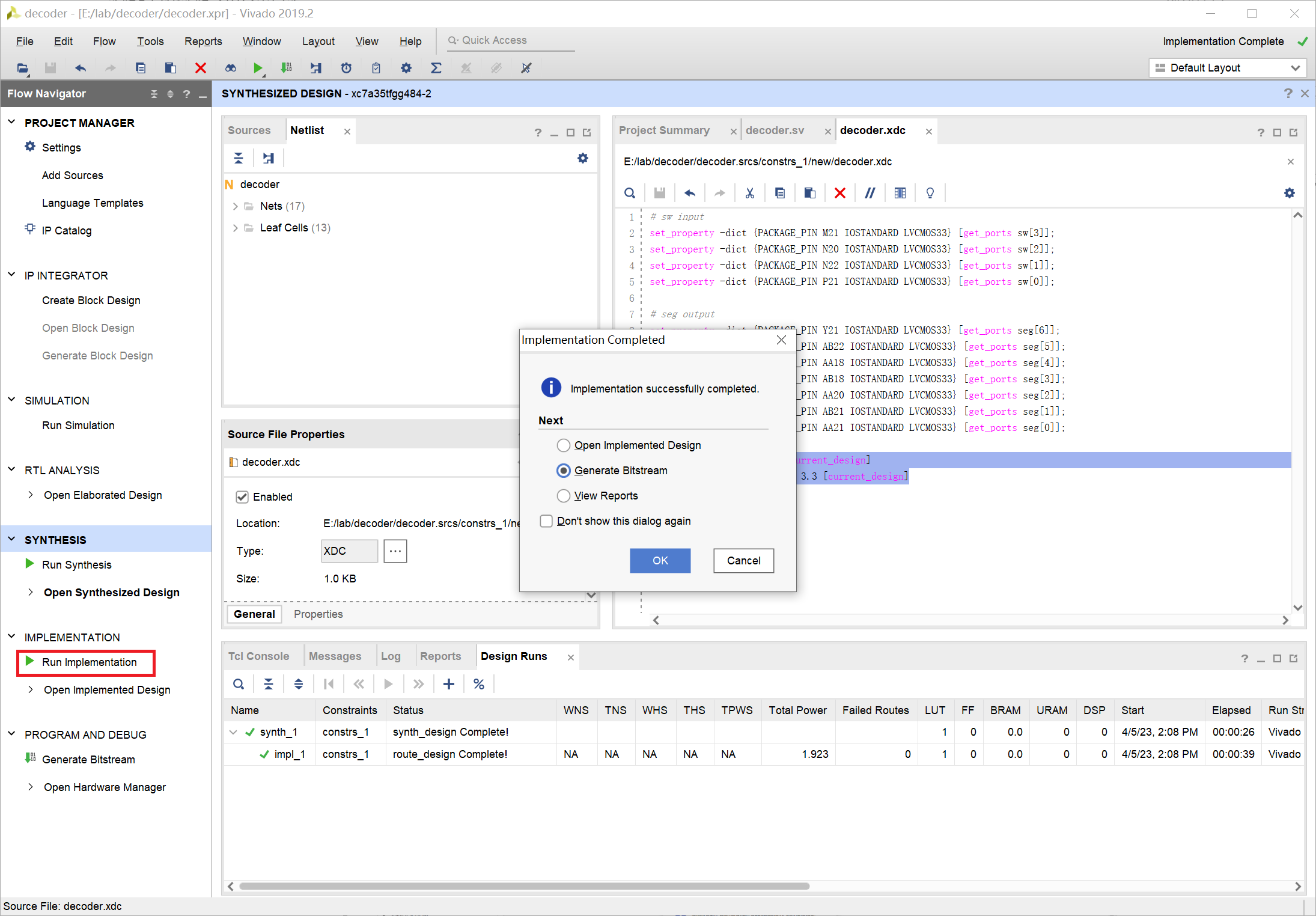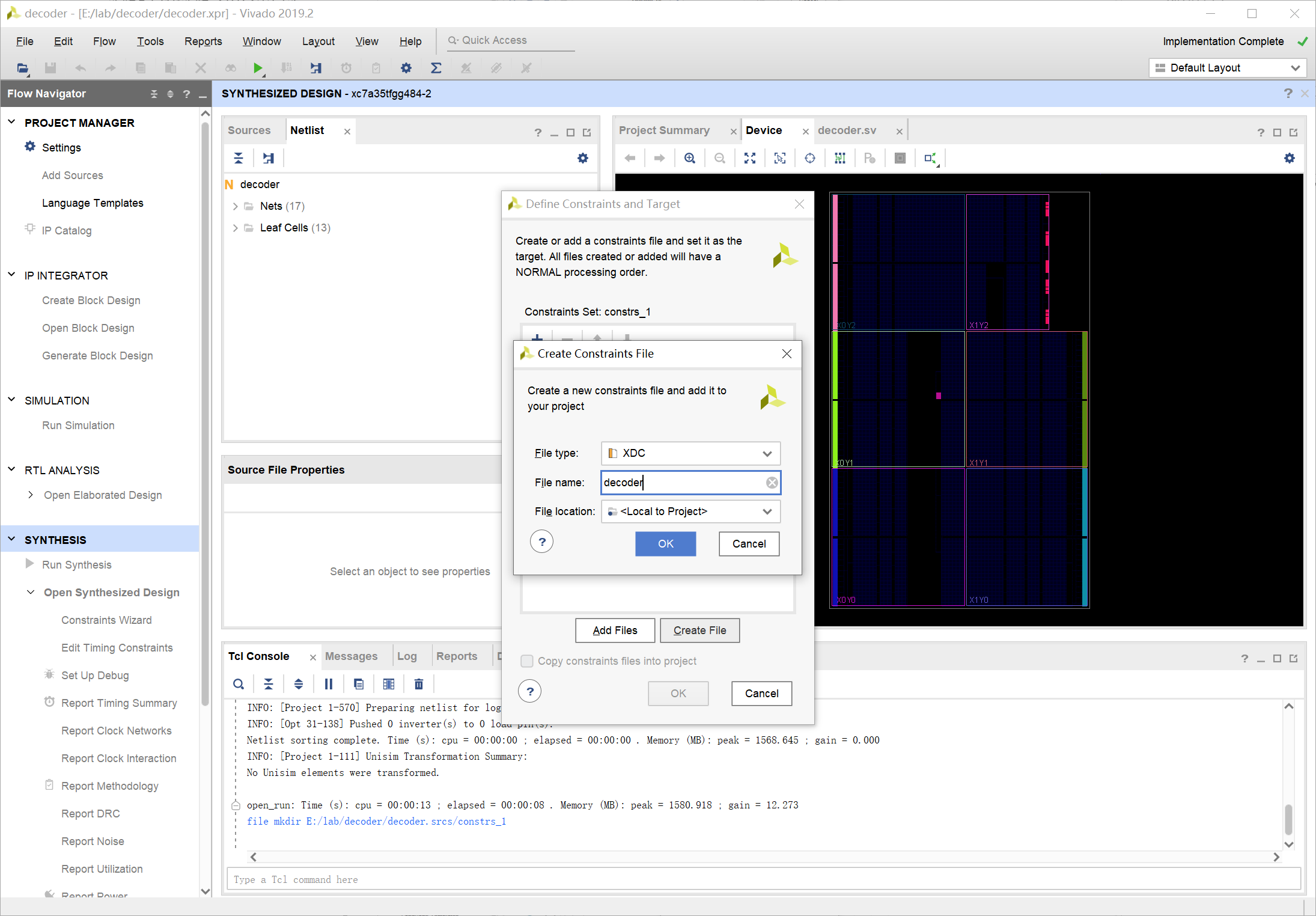 Open Implemented Design 打开实现设计,用于进行添加约束等操作。