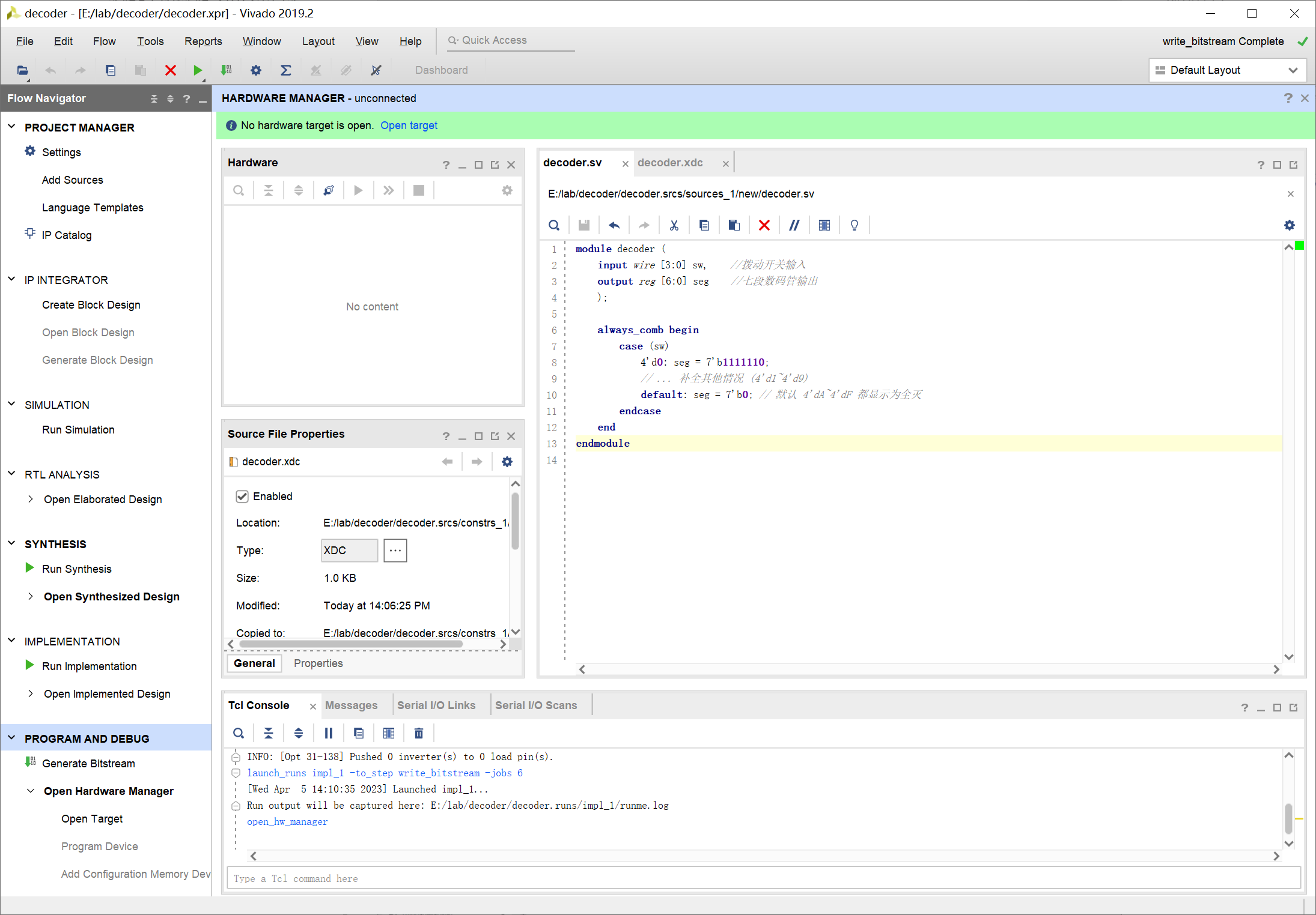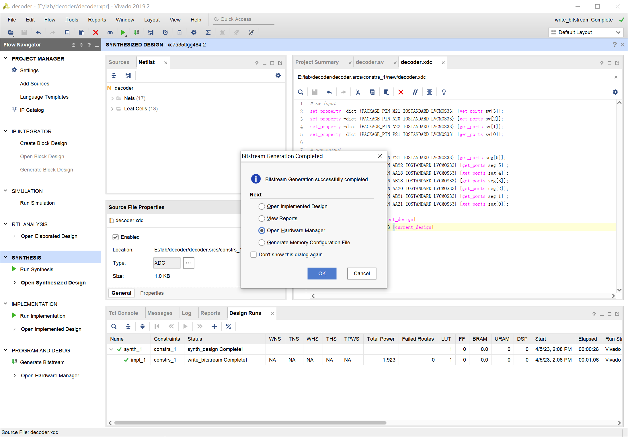 有了比特流文件之后就可以将文件装载到 FPGA 中,使其工作,这一过程也叫做配置。 成功生成 bit 文件后,选择 Open Hardware Manager,进入硬件管理界面:
