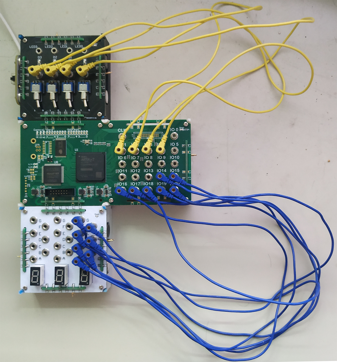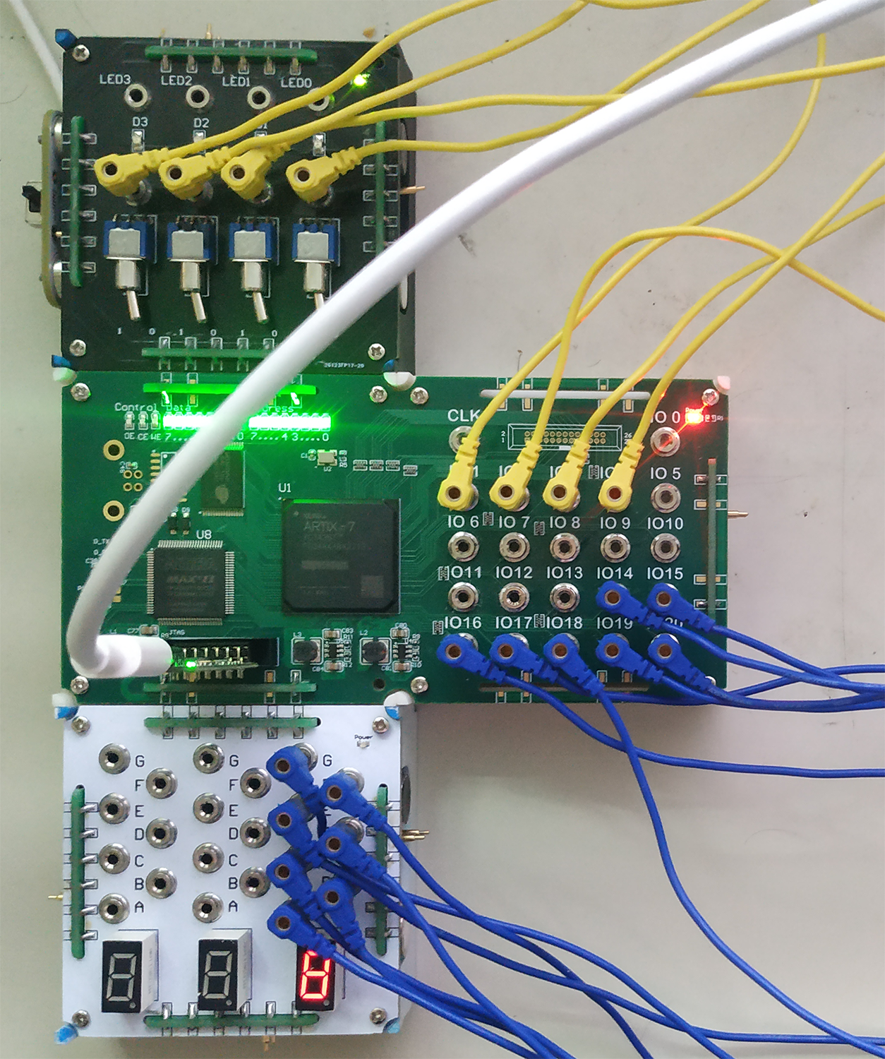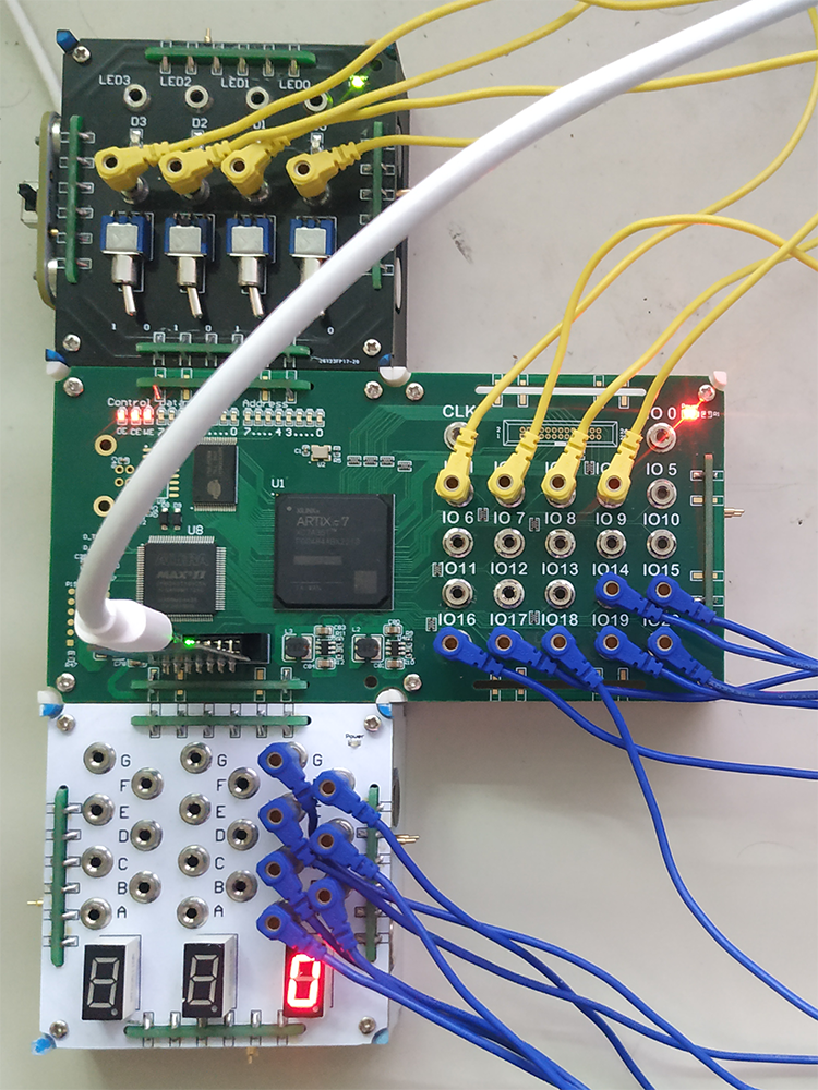 首先把开关模块,可编程模块和带译码的七段数码管模块,进行电路连接: