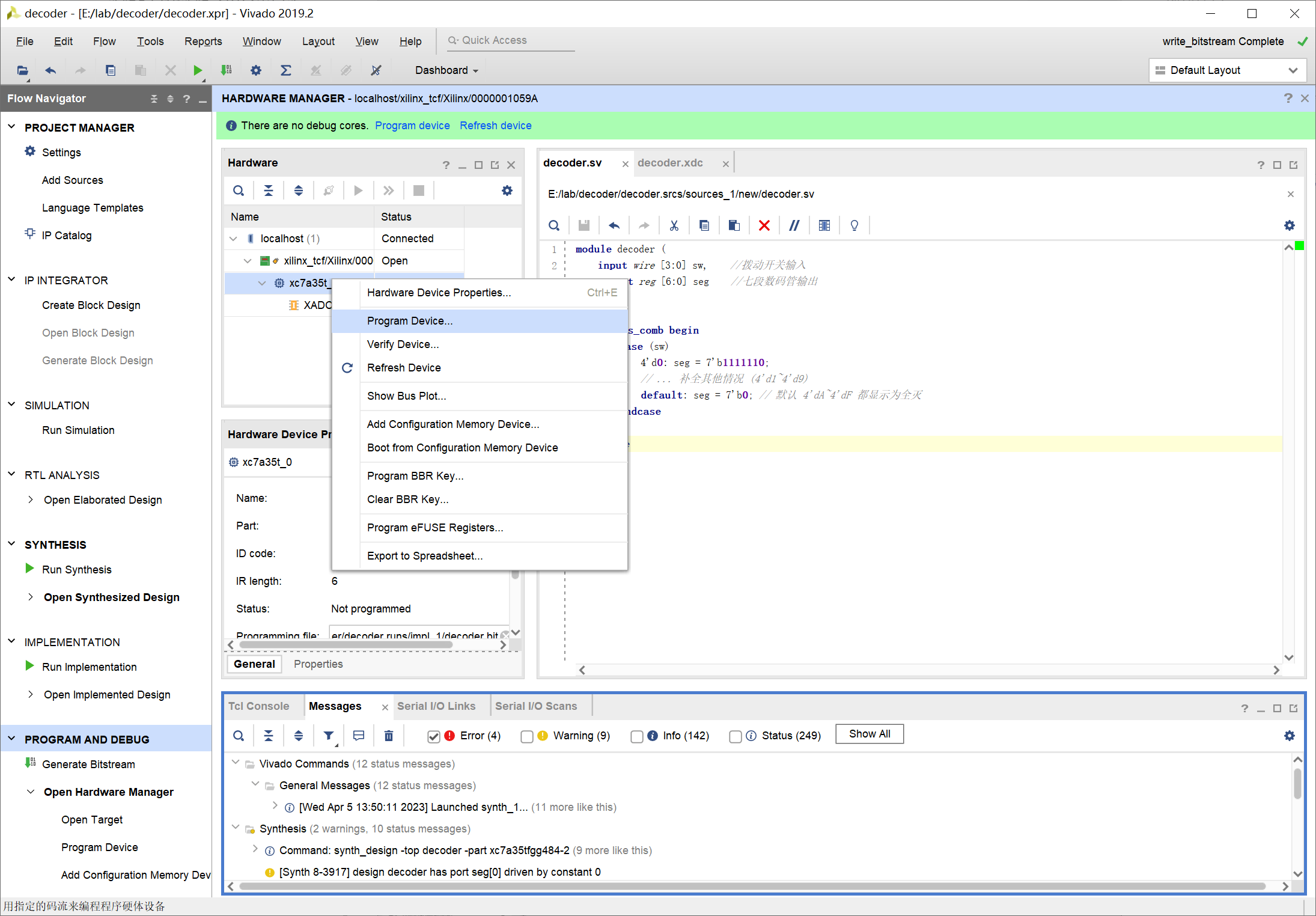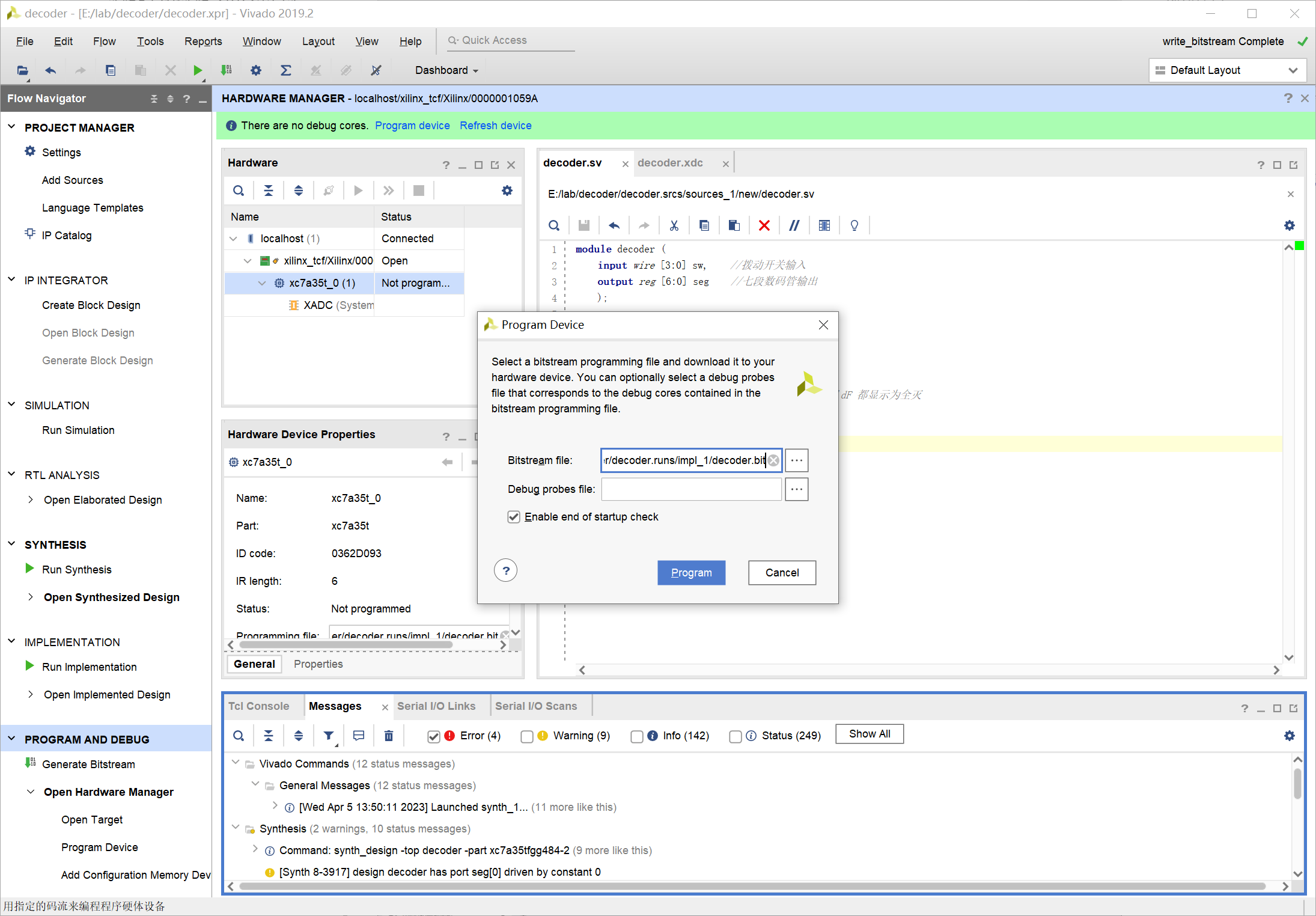 选择 Program Device... 选择装载的文件,一般默认就是本项目生成的位流文件,不用修改: