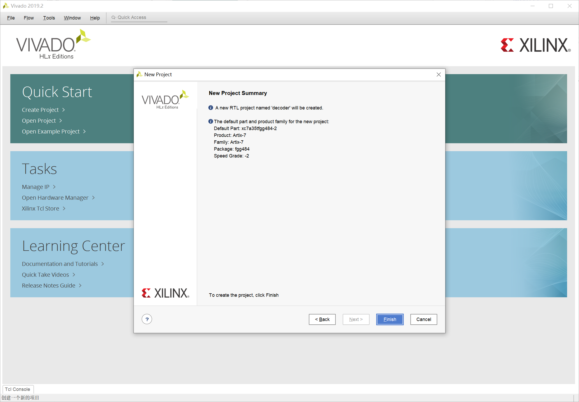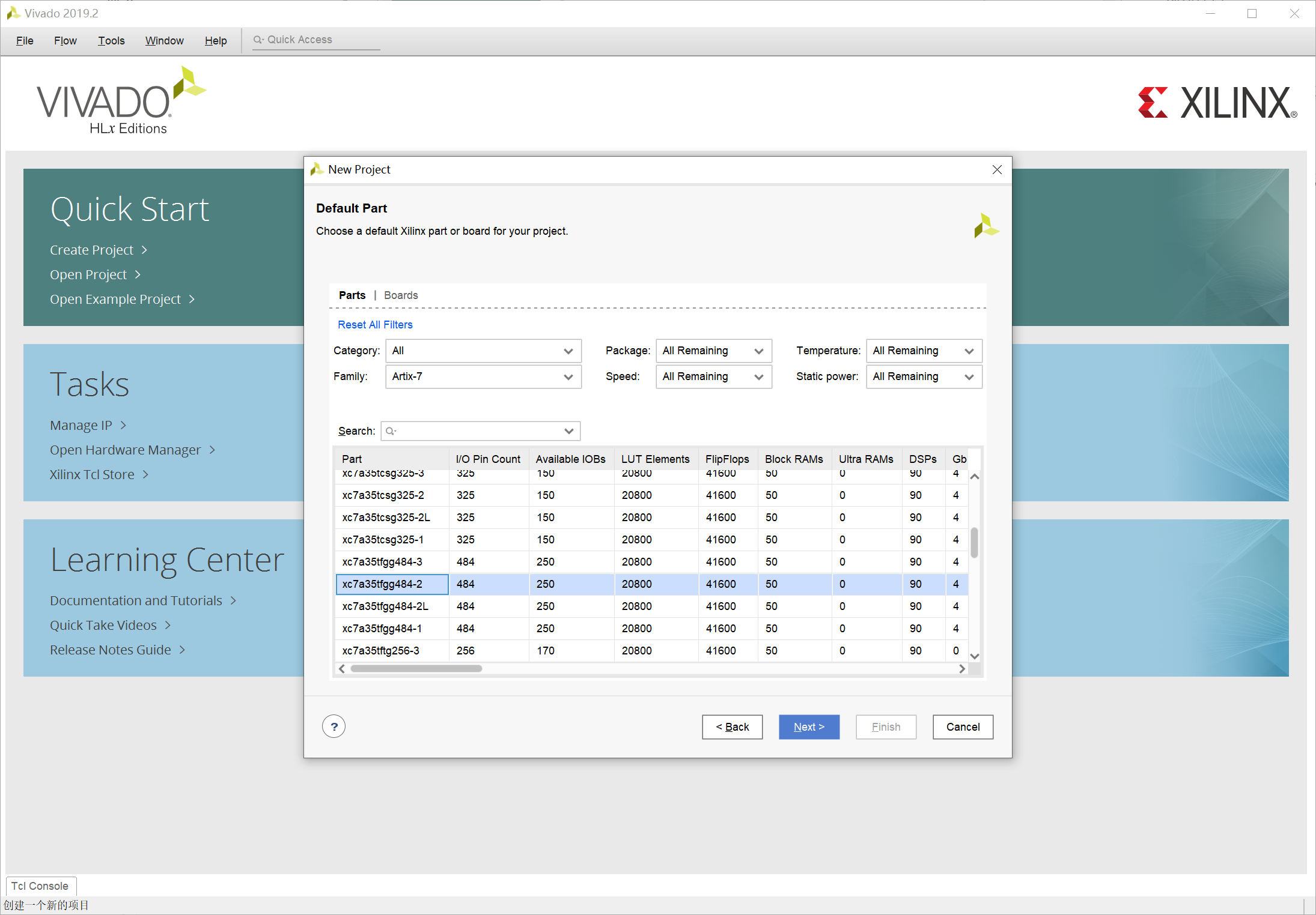 选择芯片型号 xc7a35tfgg484-2,这个型号就是可编程模块上的 FPGA 芯片型号: